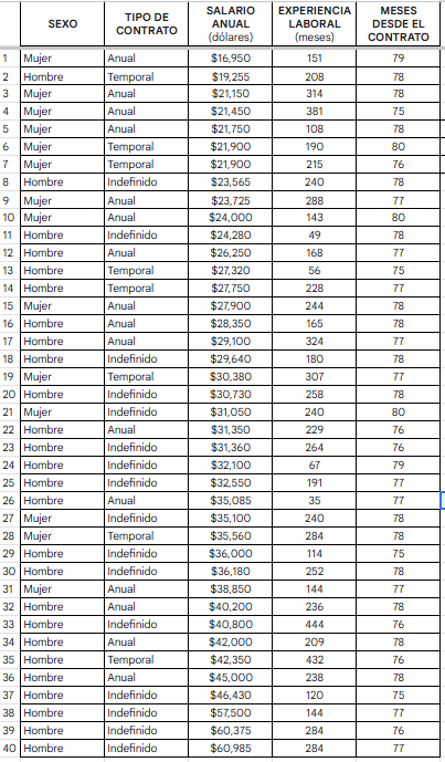 La base de datos analizada contiene información de 40 empleados de Bank América, con las siguientes variables registradas: