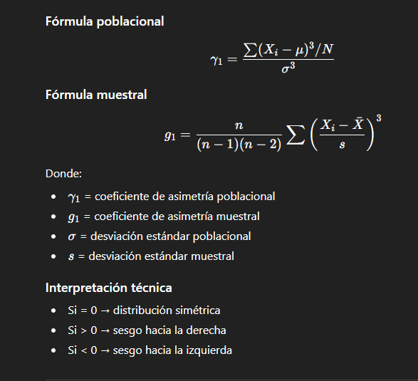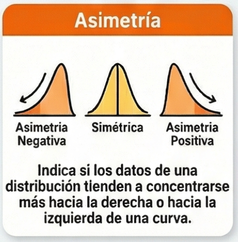 Permite identificar si la distribución de los datos es simétrica o si presenta sesgo hacia valores mayores (asimetría positiva) o hacia valores menores (asimetría negativa).