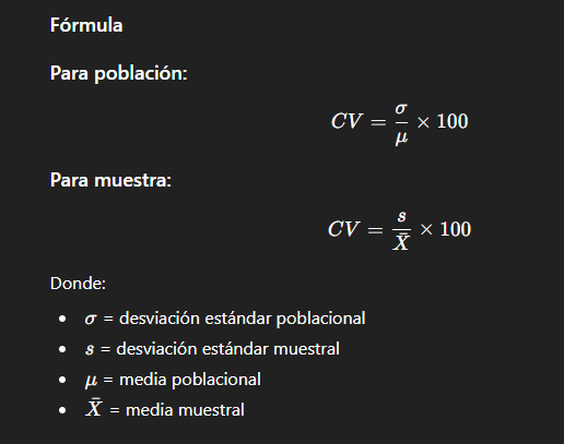 Es una medida relativa de dispersión que expresa la desviación estándar como proporción de la media, lo que permite comparar la variabilidad entre diferentes conjuntos de datos, aun cuando estén expresados en distintas unidades.