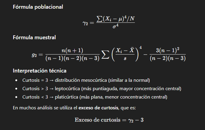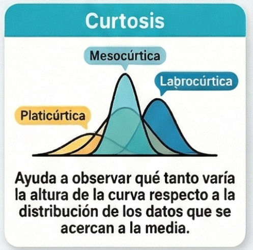 Ayuda a observar qué tanto varía la curva respecto de la distribución de los datos que se acercan a la media. Mide el grado de concentración o apuntamiento de los datos alrededor de la media, indicando si la distribución es más plana o más puntiaguda en comparación con una distribución normal.