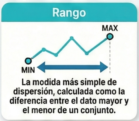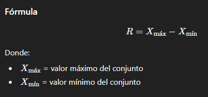 Es la diferencia entre el dato mayor y el dato menor de un conjunto de datos.Indica la amplitud total de los valores observados y proporciona una medida básica de dispersión.